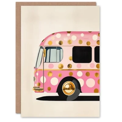 Artery8 Greeting Card Pink Glamour Party Bus Gold Polka Dot Modern For Her Woman Birthday