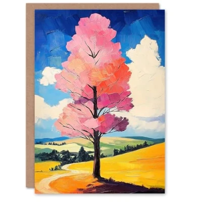 Artery8 Greeting Card Pink Tree in Countryside Field Landscape Painting Blank For Him Or Her Art Birthday