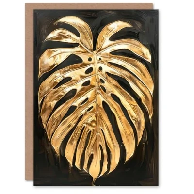Artery8 Greeting Card Plant Lover Golden Monstera Leaf Dark Painting Blank For Him Or Her Art Birthday