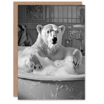 Artery8 Greeting Card Polar Bear Bathtub Bubble Bath Black White Funny Blank For Him Or Her Art Birthday