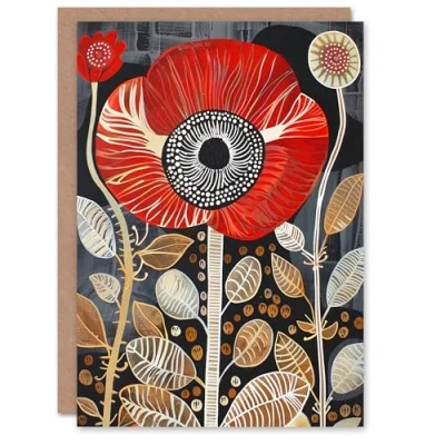 Artery8 Greeting Card Poppy Flower Red Gold Grey Modern Folk Art Blank For All Him Or Her Birthday