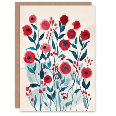 Artery8 Greeting Card Poppy Flowers Red Teal Bright Floral Watercolour For Her Woman Birthday