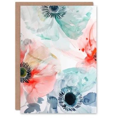 Artery8 Greeting Card Poppy Flowers Teal Blue Red Light Watercolour Blank For All Him Or Her Art Birthday