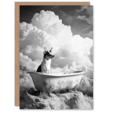 Artery8 Greeting Card Puppy Bathtub on Mountain Peak Surreal Dog Lover Blank For Him Or Her Art Birthday