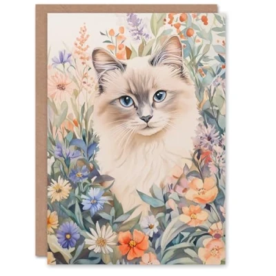 Artery8 Greeting Card Ragdoll Cat Lover Floral Pet Portrait Watercolour For Her Woman Birthday