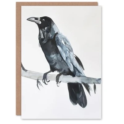 Artery8 Greeting Card Raven Bird on Tree Branch Bright Watercolour Blank For Him Or Her Art Birthday