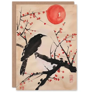 Artery8 Greeting Card Raven on Berry Tree Winter Sun Japanese Painting Blank For Him Or Her Art Birthday