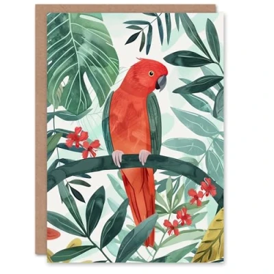 Artery8 Greeting Card Red Parakeet Bird in Tropical Jungle Watercolour Blank For Him Or Her Art Birthday