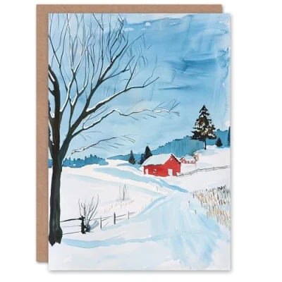 Artery8 Greeting Card Red Swedish Cottage in Winter Snow Countryside Blank For Him Or Her Art Birthday