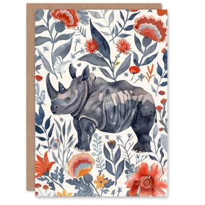 Artery8 Greeting Card Rhinoceros Rhino Blue Red Floral Pattern Portrait Blank For Him Or Her Art Birthday