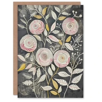 Artery8 Greeting Card Rose Flowers Pink Grey Folk Art Patterns Blank For Her Woman Birthday