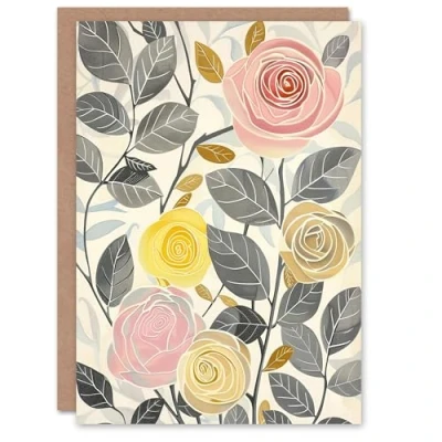 Artery8 Greeting Card Rose Flowers Pink Yellow Grey Bright Design Blank For Her Woman Birthday