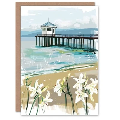 Artery8 Greeting Card Scottish Beach Pier Lily Wildflowers Painting Blank For Him Or Her Art Birthday