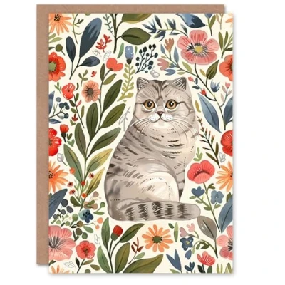 Artery8 Greeting Card Scottish Fold and Rustic Floral Pattern Cat Lover For Her Woman Birthday