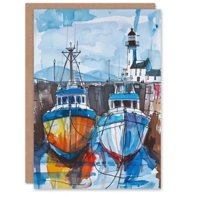 Artery8 Greeting Card Scottish Harbour Fishing Boats and Lighthouse Blank For Him Or Her Art Birthday