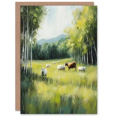 Artery8 Greeting Card Sheep Cows Grazing Countryside Field Painting Blank For Him Or Her Art Birthday