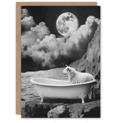 Artery8 Greeting Card Sheep in Bathtub Surreal Black White Full Moon Blank For Him Or Her Art Birthday