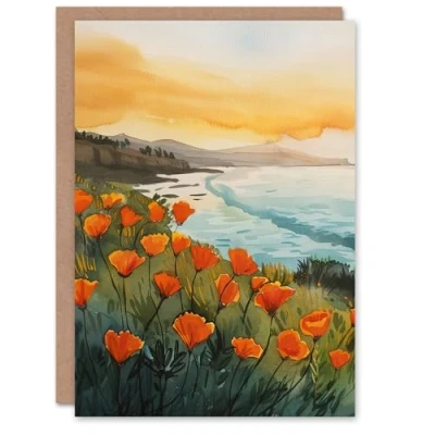 Artery8 Greeting Card Shoreline California Poppies Floral Watercolour For Her Woman Birthday
