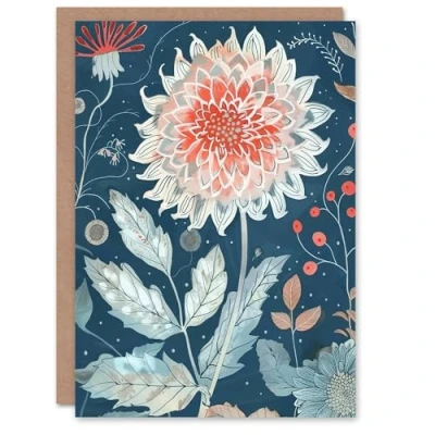 Artery8 Greeting Card Single Red Dahlia Flower Blue Botanical Artwork For Her Woman Birthday