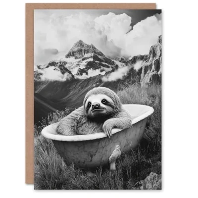 Artery8 Greeting Card Sloth in Bathtub on Mountain Black White Surreal Blank For Him Or Her Art Birthday