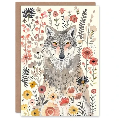 Artery8 Greeting Card Smiling Wolf Wildflower Meadow Floral Watercolour For Her Woman Birthday