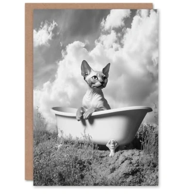 Artery8 Greeting Card Sphinx in Bathtub Black White Surreal Cat Lover Blank For Him Or Her Art Birthday
