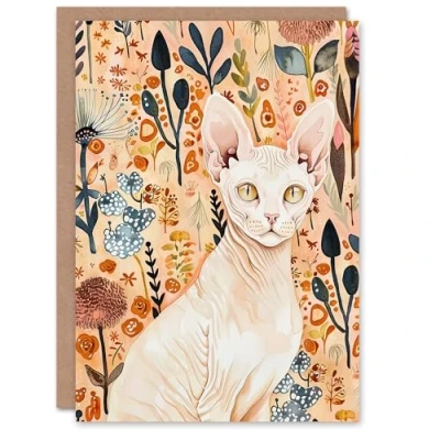 Artery8 Greeting Card Sphynx Cat in Autumn Wildflowers Watercolour Blank For Him Or Her Art Birthday