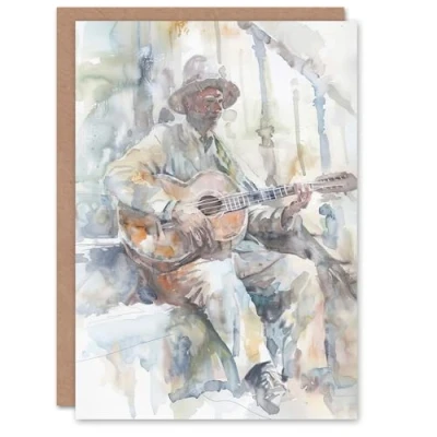 Artery8 Greeting Card Street Musician Playing Acoustic Guitar Watercolour Blank For All Him Or Her Art Birthday