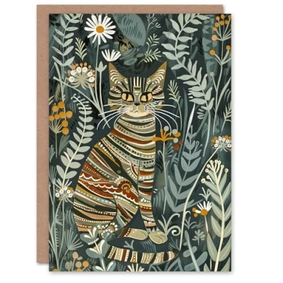 Artery8 Greeting Card Striped Cat in Floral Botanical Garden Folk Art Blank For All Him Or Her Birthday