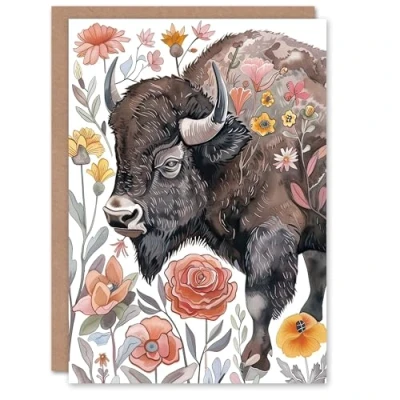 Artery8 Greeting Card Stylised Majestic Bison in Spring Wildflowers For Her Woman Birthday
