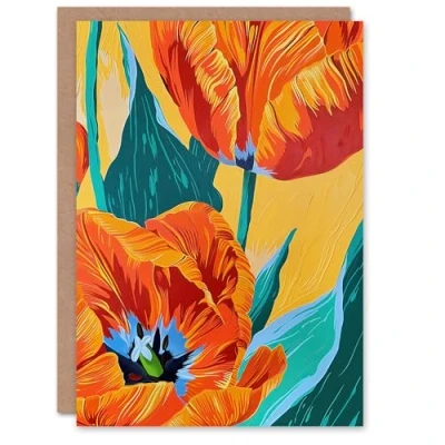 Artery8 Greeting Card Stylised Orange Teal Tulip Flowers Vibrant Floral For Her Woman Birthday