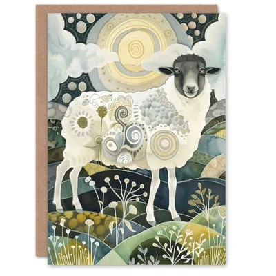 Artery8 Greeting Card Stylised Sheep with Patterns Full Moon Folk Art Blank For Him Or Her Birthday