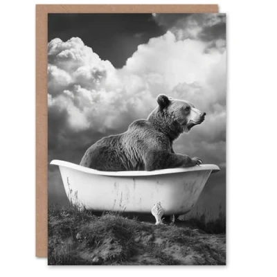 Artery8 Greeting Card Surreal Bear in Bathtub Black White Bath Time Blank For Him Or Her Art Birthday