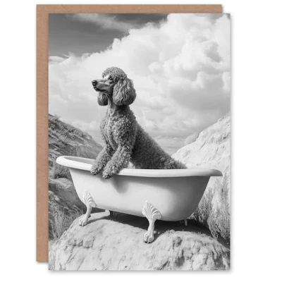 Artery8 Greeting Card Surreal Dog Lover Black White Poodle in Bathtub Blank For Him Or Her Art Birthday