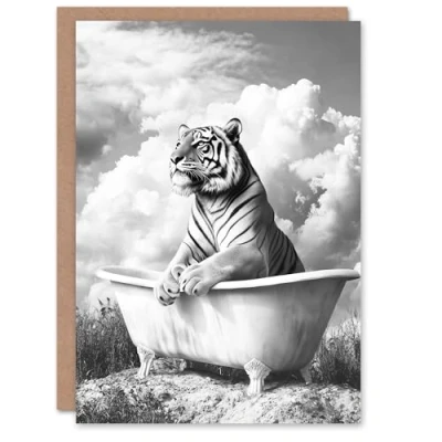 Artery8 Greeting Card Tiger Bathtub Black White Surreal Big Cat Lover Blank For Him Or Her Art Birthday
