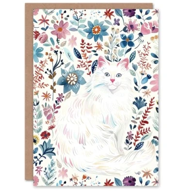 Artery8 Greeting Card Turkish Angora and Floral Pattern White Cat Lover For Her Woman Birthday