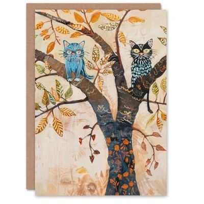 Artery8 Greeting Card Two Kittens on an Autumn Tree Folk Art Cat Lover Blank For Him Or Her Birthday