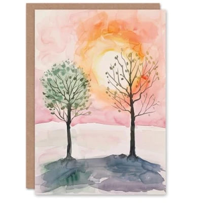 Artery8 Greeting Card Two Summer Trees in Pink Orange Sunset Landscape Blank For Him Or Her Art Birthday