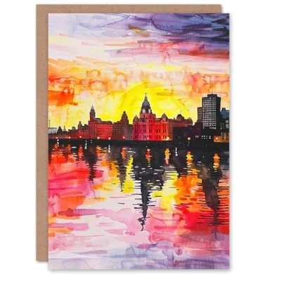 Artery8 Greeting Card Vibrant Liverpool City Waterfront Sunset Painting Blank For Him Or Her Art Birthday