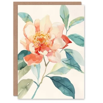 Artery8 Greeting Card Watercolour Camellia Flower Painting Soft Floral For Her Woman Birthday