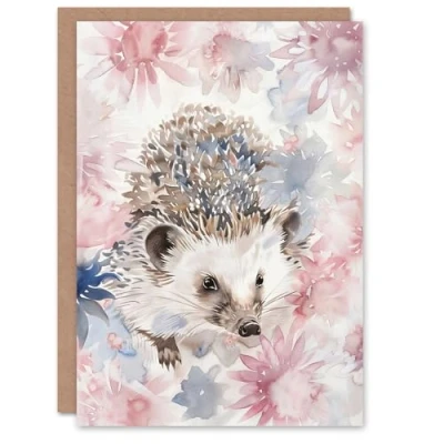 Artery8 Greeting Card Watercolour Hedgehog and Flowers Pink Pastel Blank For All Him Or Her Art Birthday