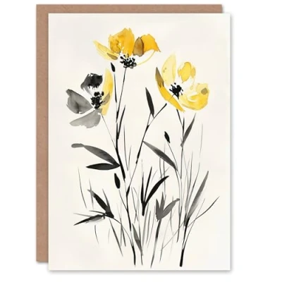 Artery8 Greeting Card Wildflower Blooms Black White Yellow Watercolour For Her Woman Birthday