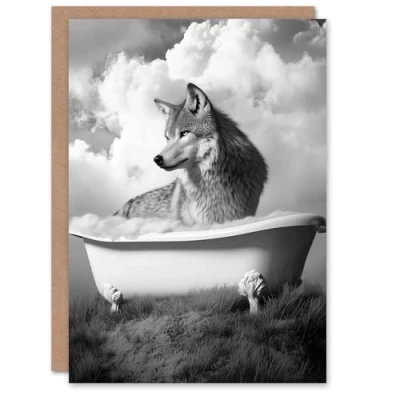 Artery8 Greeting Card Wolf in Bathtub Surreal Black White Bubble Bath Blank For Him Or Her Art Birthday