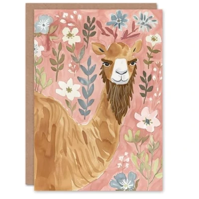 Artery8 Grumpy Bearded Camel Cartoon Floral Watercolour Blank For Him Or Her Art Birthday Card