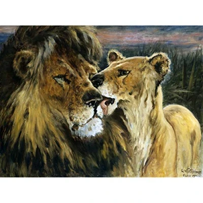 Artery8 Gustav Wertheimer Lion Couple Nature Animal Painting Art Print Canvas Premium Wall Decor Poster Mural