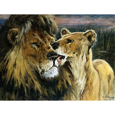 Artery8 Gustav Wertheimer Lion Couple Nature Animal Painting Large XL Wall Art Canvas Print