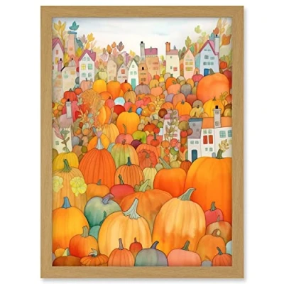 Artery8 Halloween Pumpkin Festival Autumn Harvest Modern Folk Art Watercolour Painting Artwork Framed A3 Wall Print