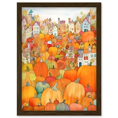 Artery8 Halloween Pumpkin Festival Autumn Harvest Modern Folk Art Watercolour Painting Artwork Framed Wall Print A4