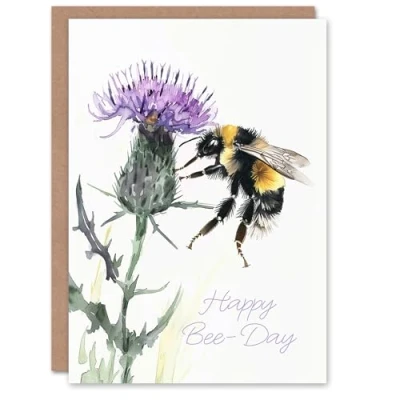 Artery8 Happy B Day Watercolour Thistle Flower Bumble Bee Blank For Him Or Her Art Birthday Card