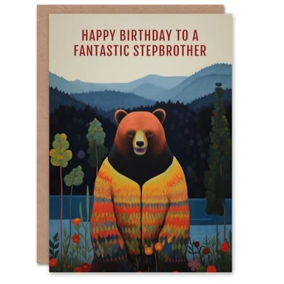 Artery8 Happy Birthday Card to a Fantastic Stepbrother Hipster Hippie Bear Hippy Cardigan